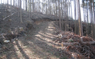 作業道とは、立木の伐採、伐採した木の枝払いや造材、木寄せ集材などの木材生産、山の施業(植林、下刈、間伐等)、山林管理や調査を行うために使う道のことです。 低コストかつ高効率な木材生産を行う為には、作業道を開設することはかかせません。
