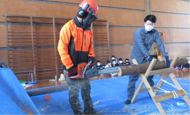 最後に、技術課議員が実際にチェーンソーで丸太をカットするところを見て、木くずの感触と臭い、音を感じてもらい林業に関わる人のやりがいなどを勉強してもらいます。