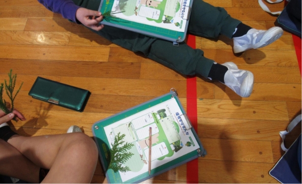 初めに、スギ・ヒノキの葉に触れ、匂いや感触の違いを感じてもらいます。